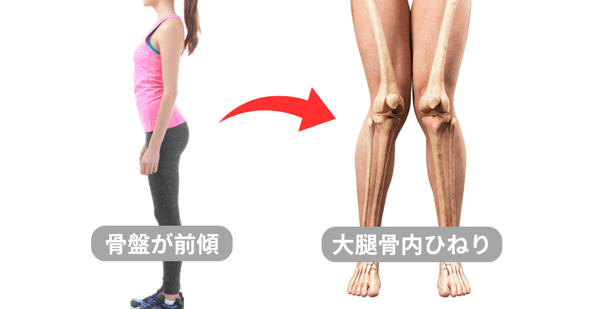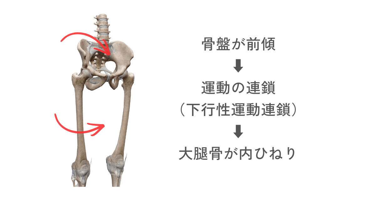 骨盤が前傾(腰が反る)することによって、運動の連鎖によって大腿骨も内側にひねられる環境になってしまうため、内股が常態化となっている方は骨盤が前傾(腰が反っている)していると考えられます。
