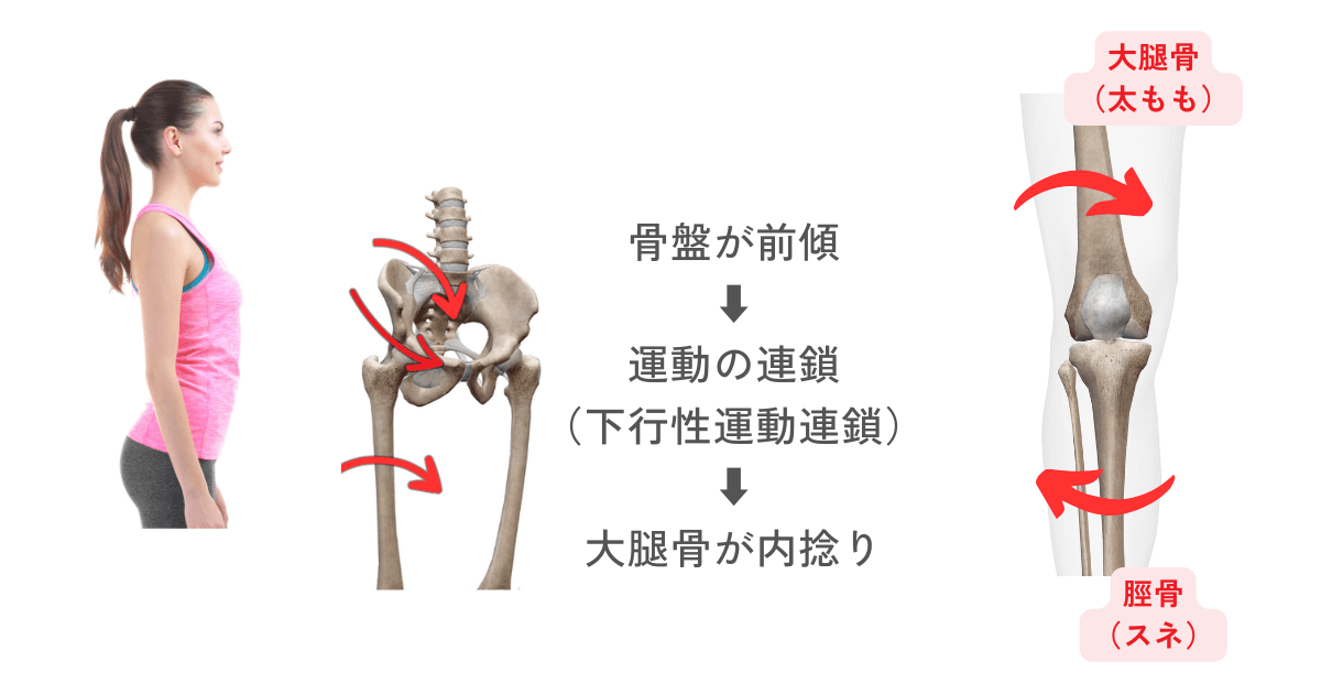 骨盤が前傾すると運動の連鎖によって、大腿骨は内にひねられます。